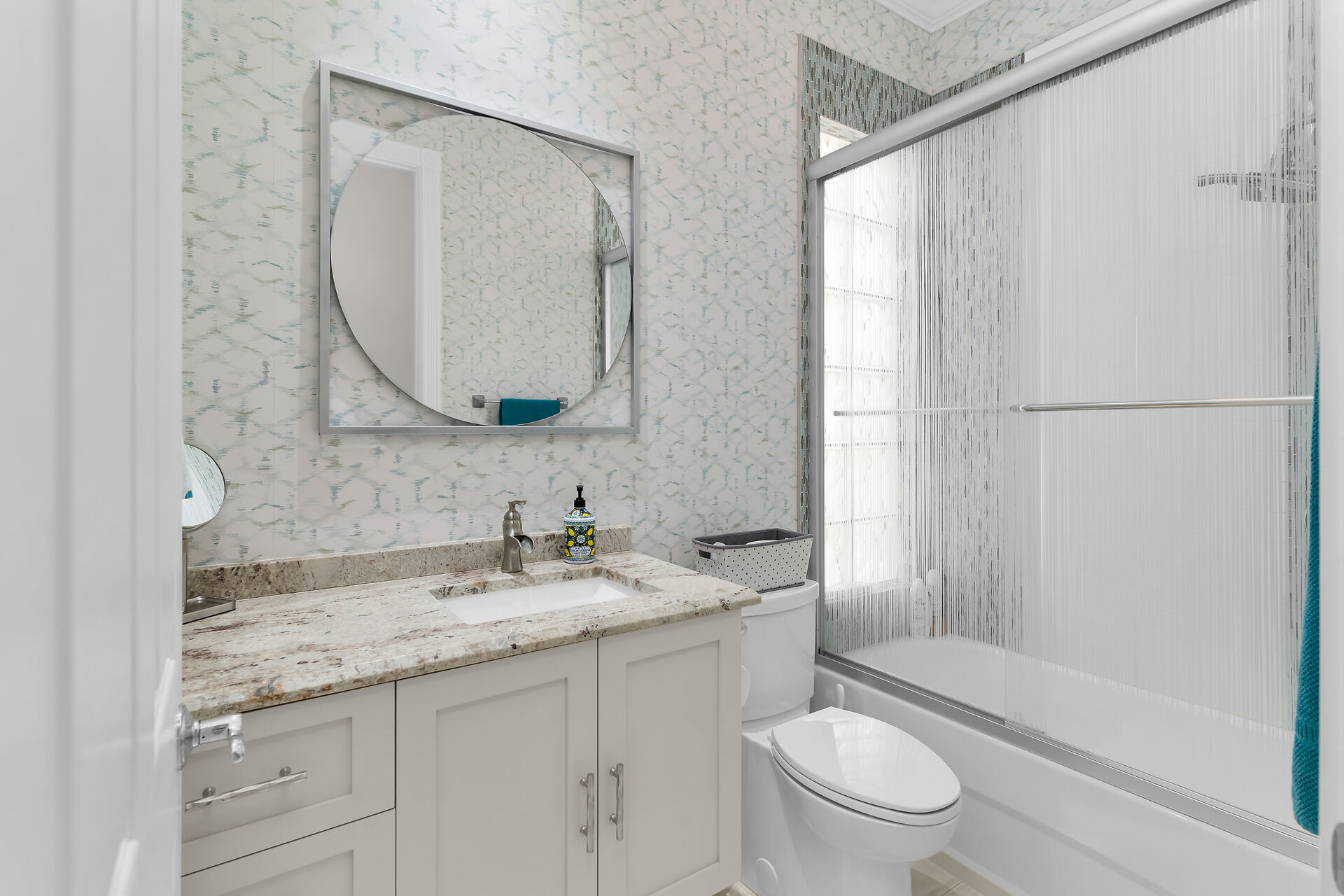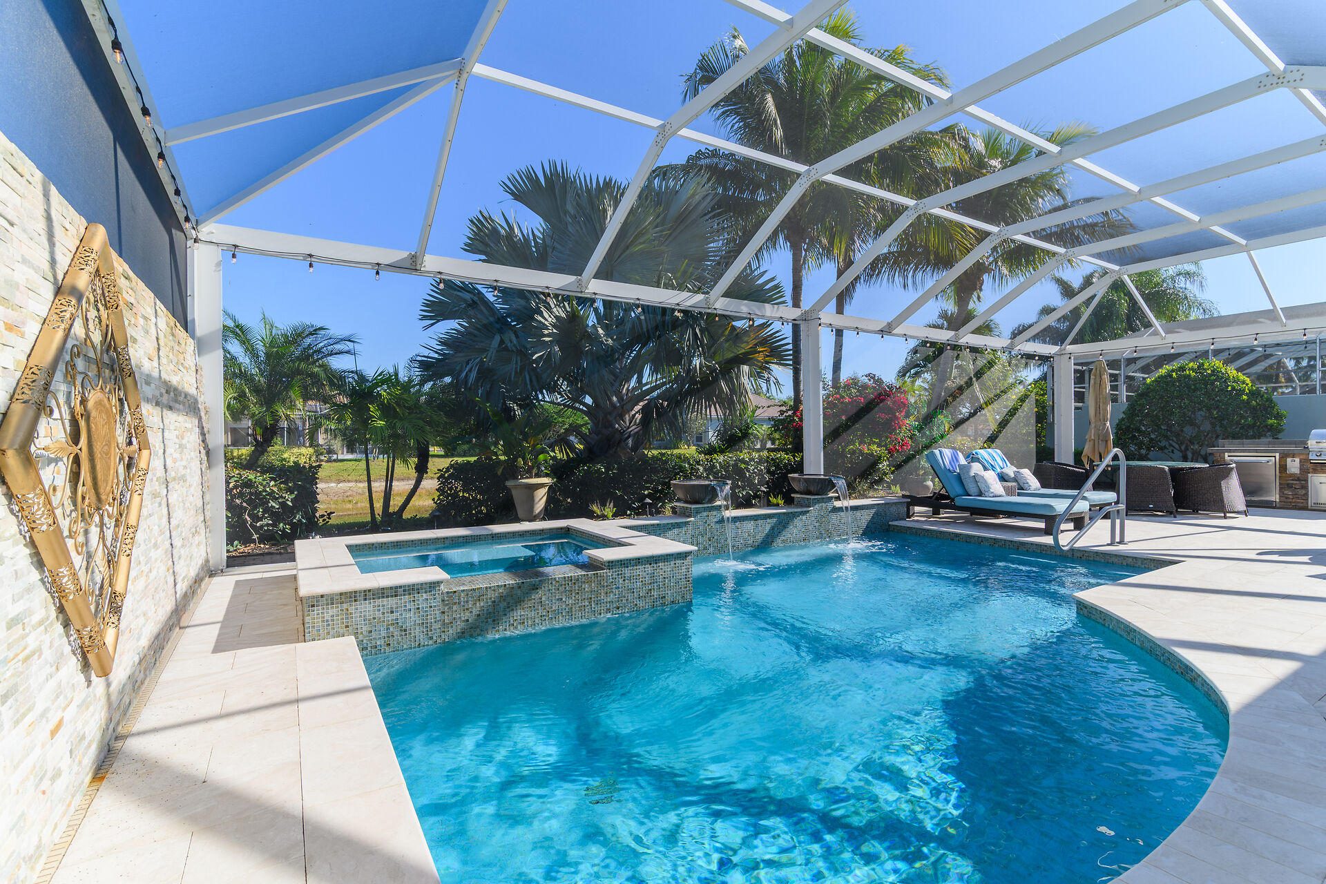 This four bedroom/four bath single family home is a rarely available 2800-sq. ft. model, especially with the many designer upgrades it features, in the popular Verona Walk community. This original DiVosta-built home has poured concrete walls, a built-in vacuum cleaning system, and a screened, tiled front porch that leads to an airy foyer. Enjoy sophisticated Florida living in your formal extended living and dining rooms. Porcelain tile floors cover the entire living space, which also features a fireplace with heater, wine refrigerator, and Patricia chandelier. Outside, enjoy the heated pool and spa and retractable awning with a water view through a panoramic lanai cage screen and complete privacy.
